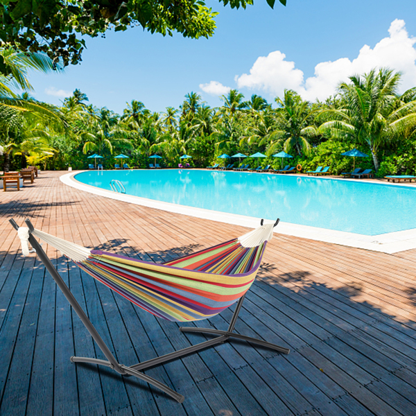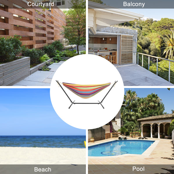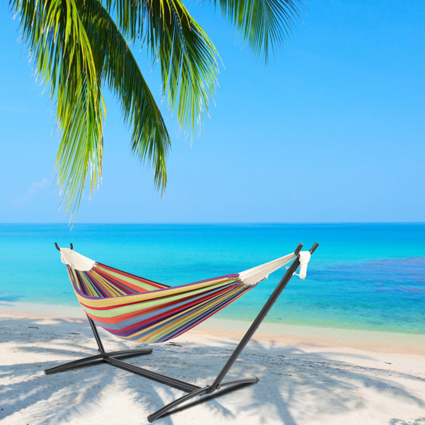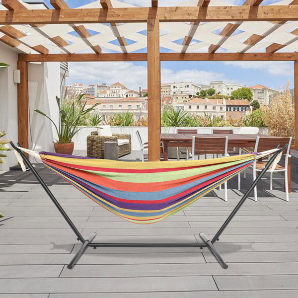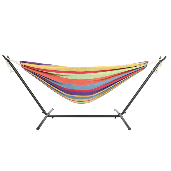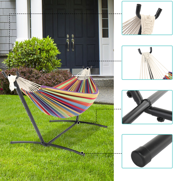 Enjoy yourself in our 9ft Black Steel Pipe Hammock Frame with 200*150cm Polyester Cotton Hammock Small Color Strip Natural Rope Iron Hammock Set! It is composed of a hammock, a hammock stand and a portable handbag. Each item in this offer is made with premium material and delicate workmanship, with ensured quality and durability. Thus, you can carry it along easily for all kinds of outdoor activities. Also, the hammock could bear up to 150kg weight to the maximum so that even two persons are allowed to lie on it freely without any worry and concern. What are you waiting for? The intoxicating leisure time is waving its hands to you!