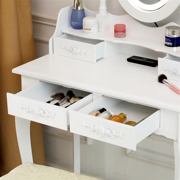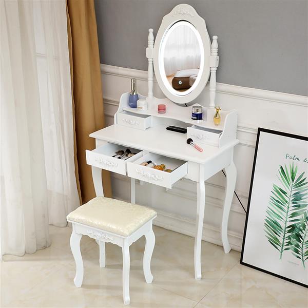 Girls are eager for a private dressing table for makeup every day. Beautiful dressing table is always attractive. Do you want to buy a set of dressing table for yourself? If so, this Modern Concise 4-Drawer 360-Degree Rotation Removable,The mirror of this dresser has the function of LED touch screen, the touch switch can be opened and closed, very fashionable and convenient. Made with superior wood and MDF, it brings great durability and ultra comfort. It is so exquisite with built-in mirror and 4 drawers. The mirror can be 360-degree rotation and removed to meet your needs. It is a dressers as well as a common table. All in all, this dresser is really smart and stylish to satisfy you!